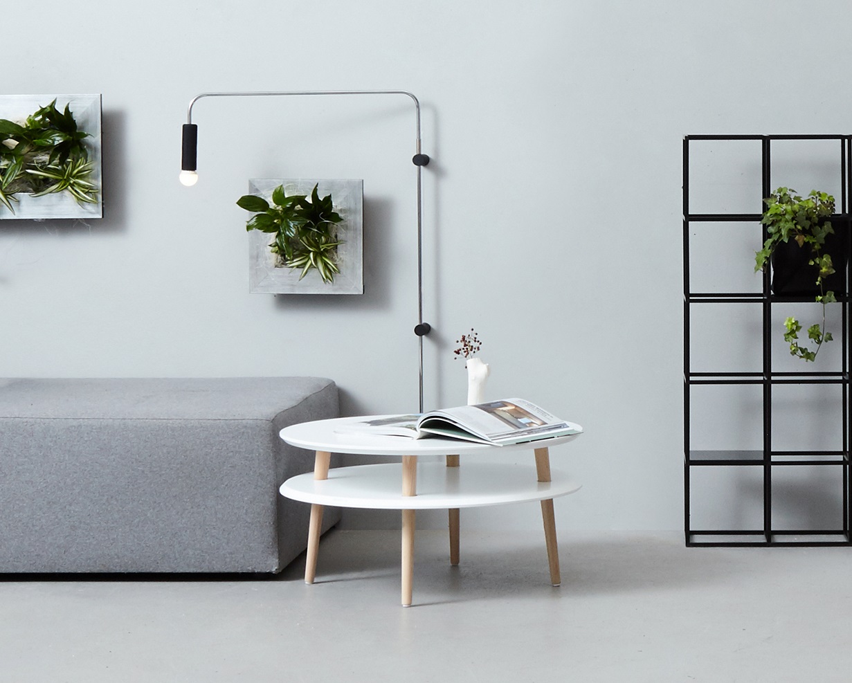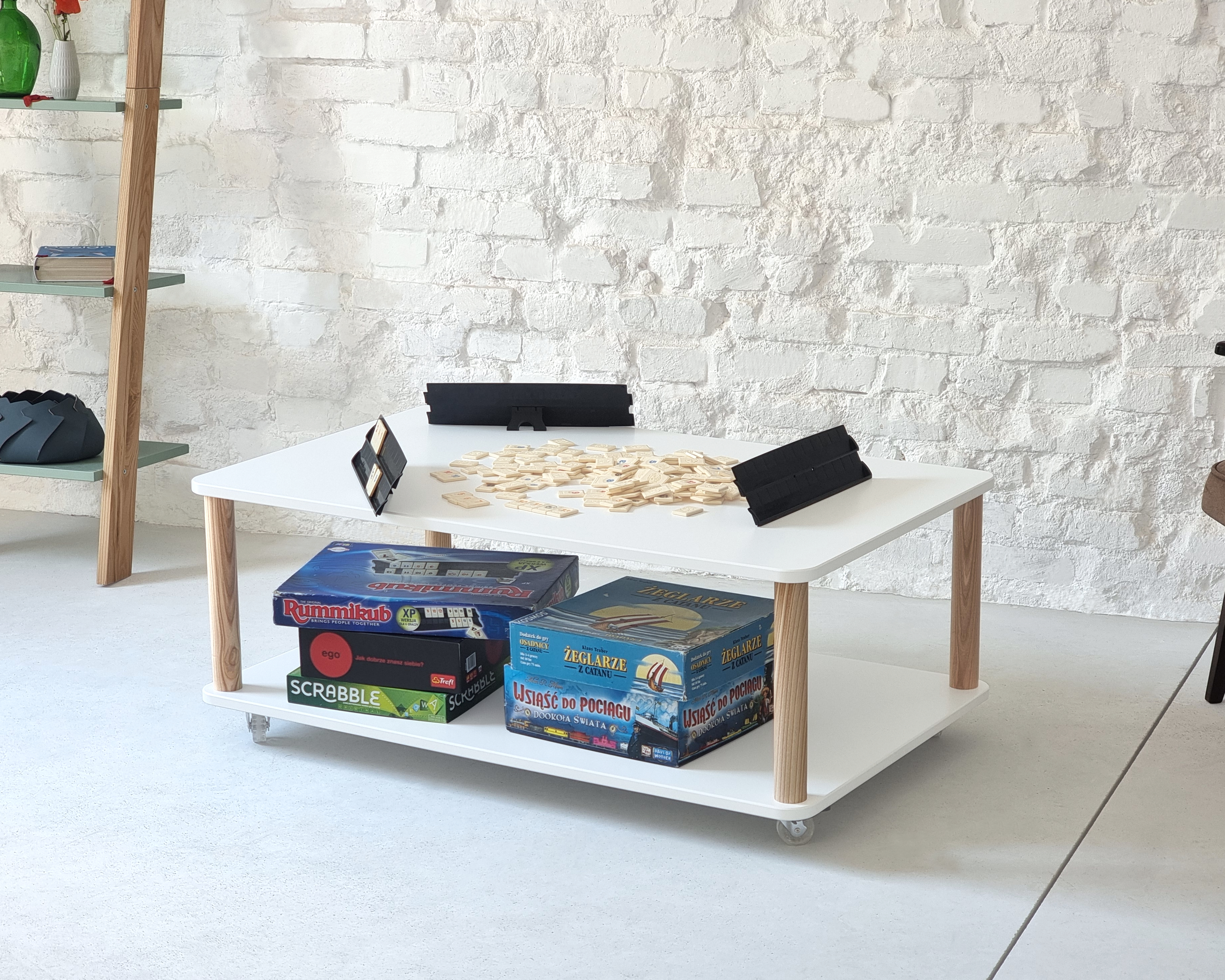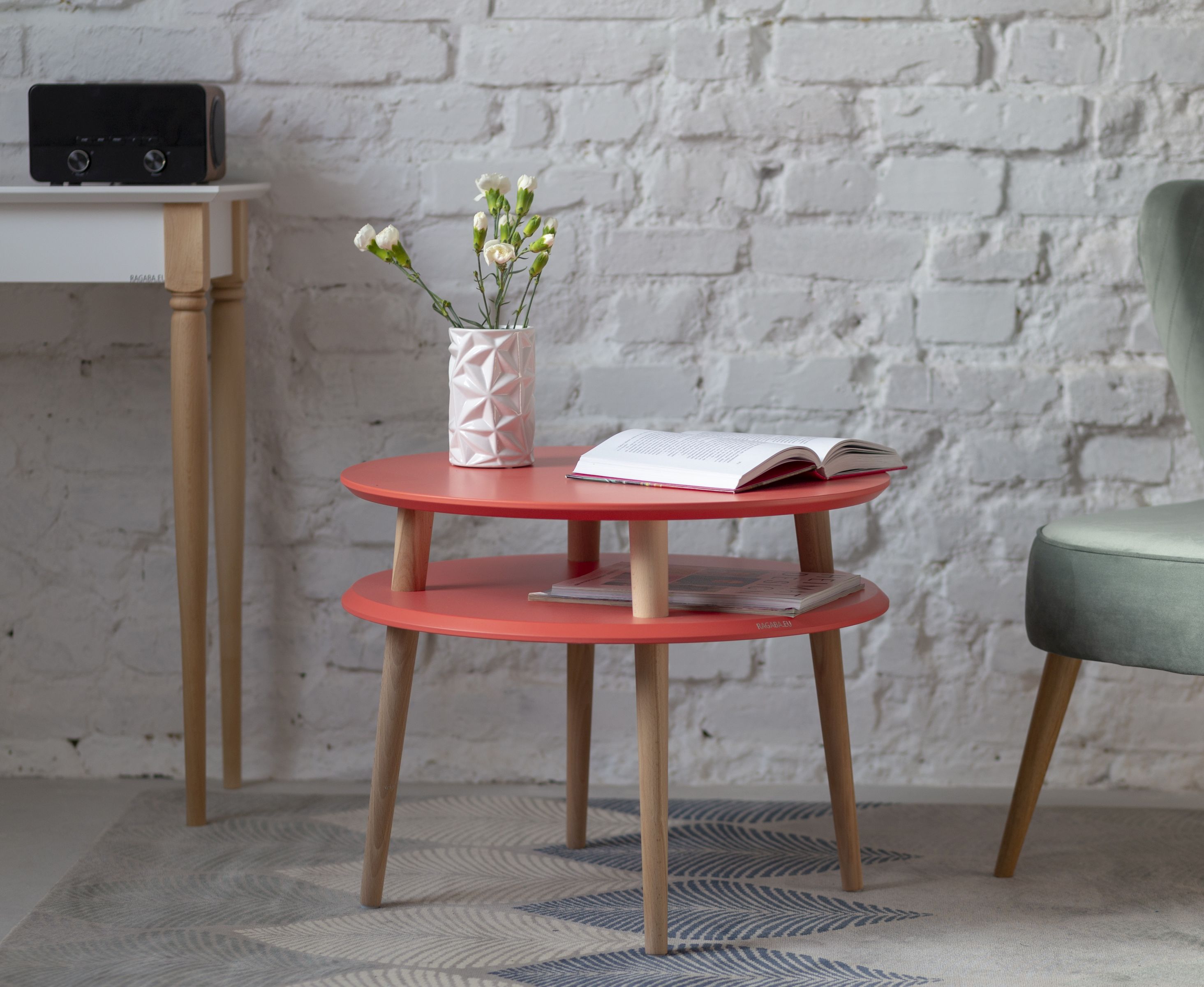 In our offer, you will find a wide range of coffee tables that combine comfort and functionality for the user. One of them is UFO, a small coffee table perfect for narrow spaces and small apartments. The UFO coffee table is a minimalist piece of furniture made from two tabletops and beechwood legs. The tabletops come in a wide range of colours, allowing you to brighten up your interior with this small coffee table. You have the option to select the colour for each tabletop and create personalized furniture.