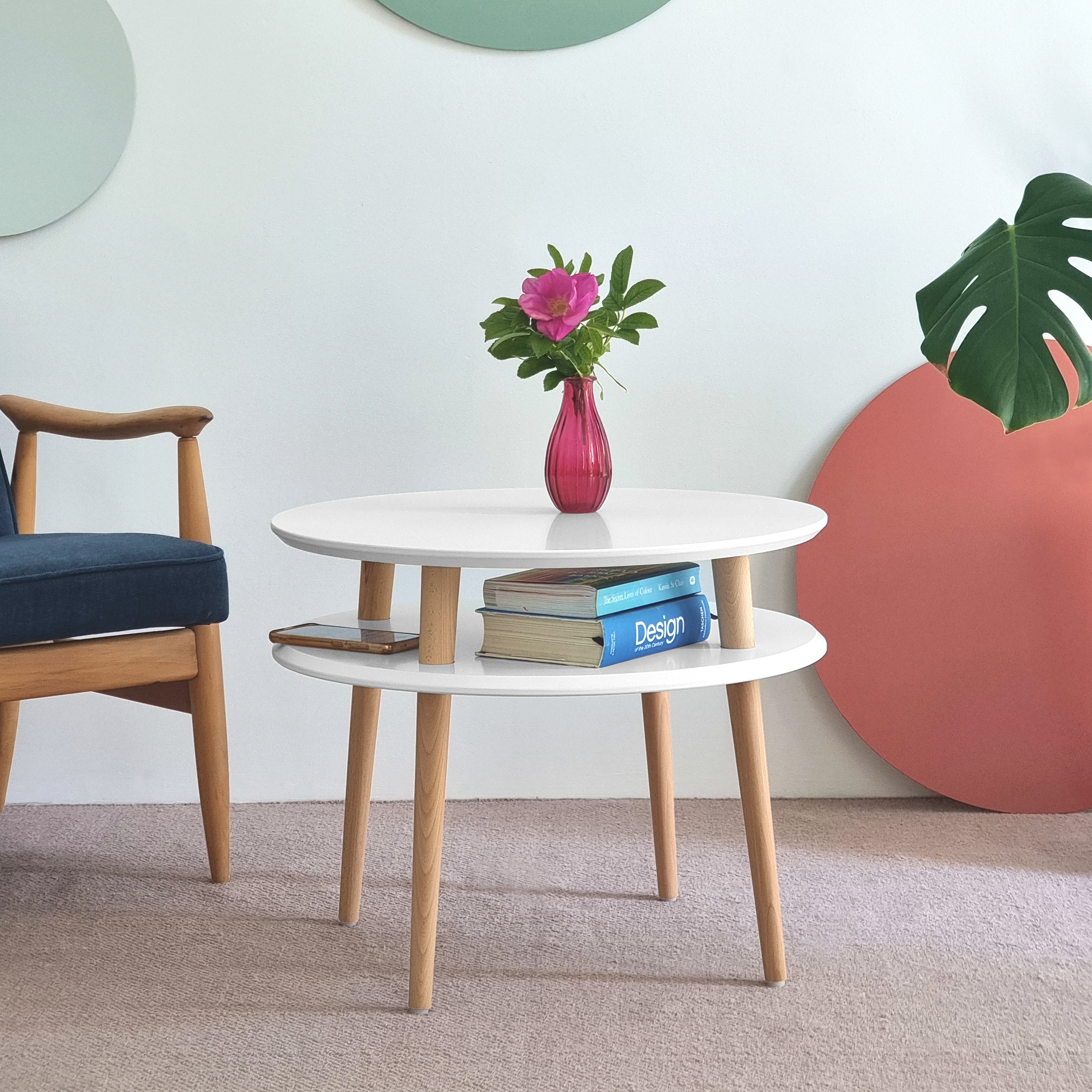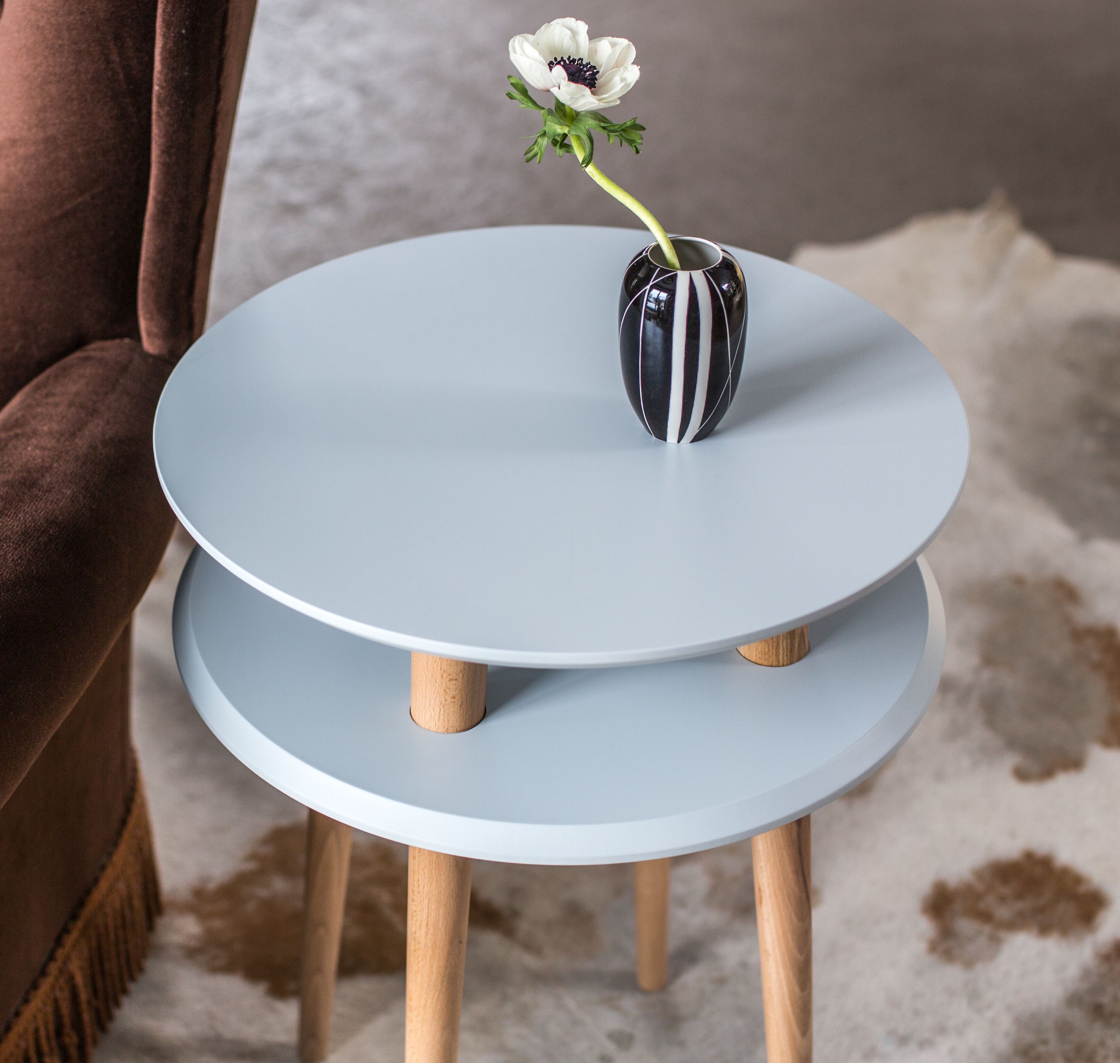 Our UFO coffee tables are highly customisable: they come in three diameters (70 cm, 57 cm, 45 cm) and three heights (61 cm, 45 cm, 35 cm), which can be mixed and matched. UFO is a modern two-tier coffee table that brings a clean, functional accent to any interior. The space between the tabletops is ideal for keeping your favourite book or magazine within easy reach. The legs are crafted from solid beech wood, valued for its strength and durability, while the tabletops are made from laminated and lacquered MDF.
