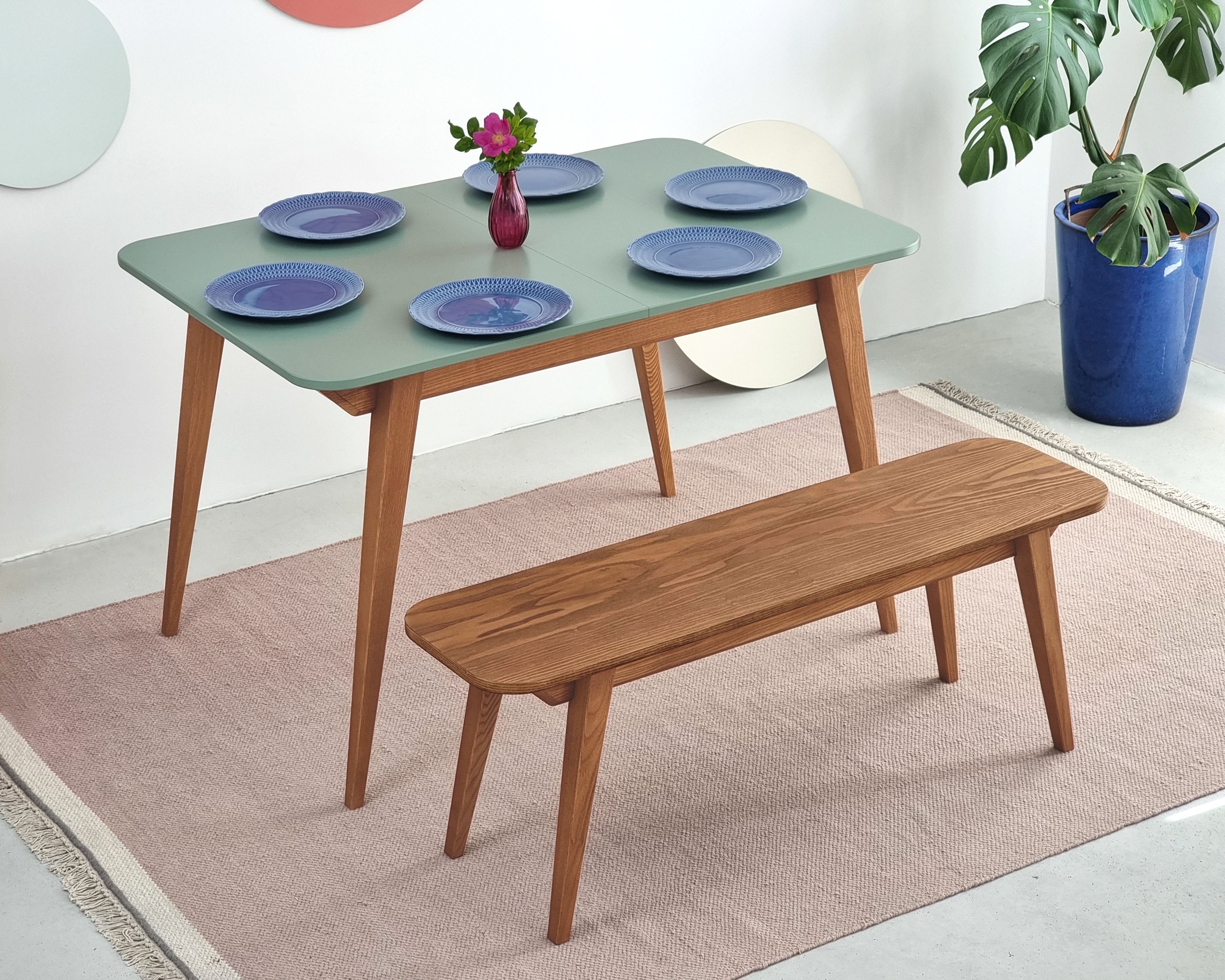 This rectangular dining room table works perfectly as a dining table for 6 seats, and thanks to its two hidden extension boards, it easily transforms into a dining table for 8 people. Supported by sturdy wooden legs, this kitchen table rectangular model is both functional and elegant, making it ideal for creating a cozy dining area. When combined, such a dinette table with bench creates not just a functional setup, but a warm and inviting space that works equally well in the living room, dining room, or kitchen.