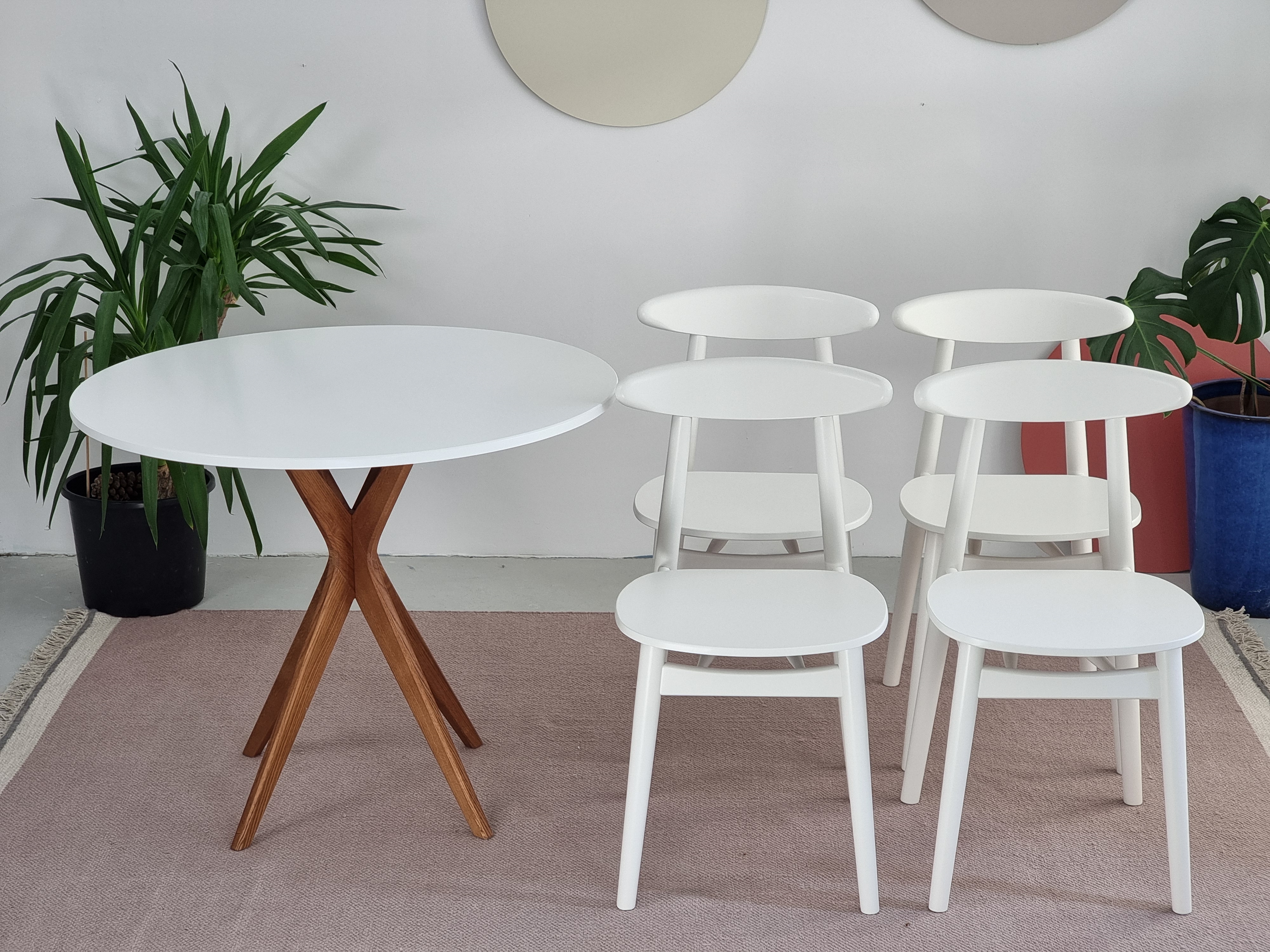 This white dining table and chairs set comes complete with four Biju dining chairs—each crafted from high-quality beech wood. These solid wooden chair pieces are not only strong and stable but also lightweight and easy to move, making them a practical choice for everyday use.