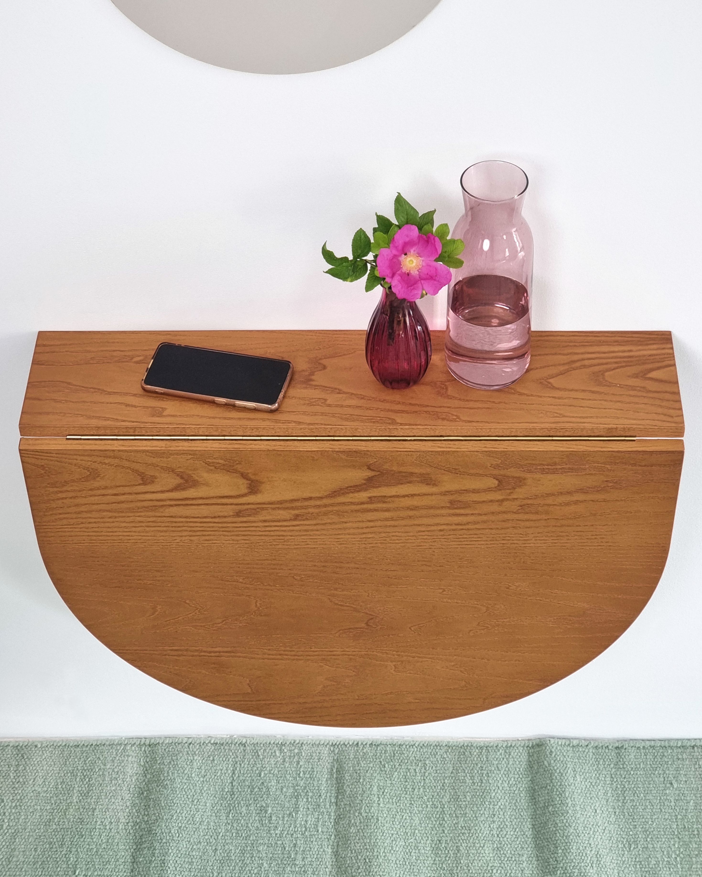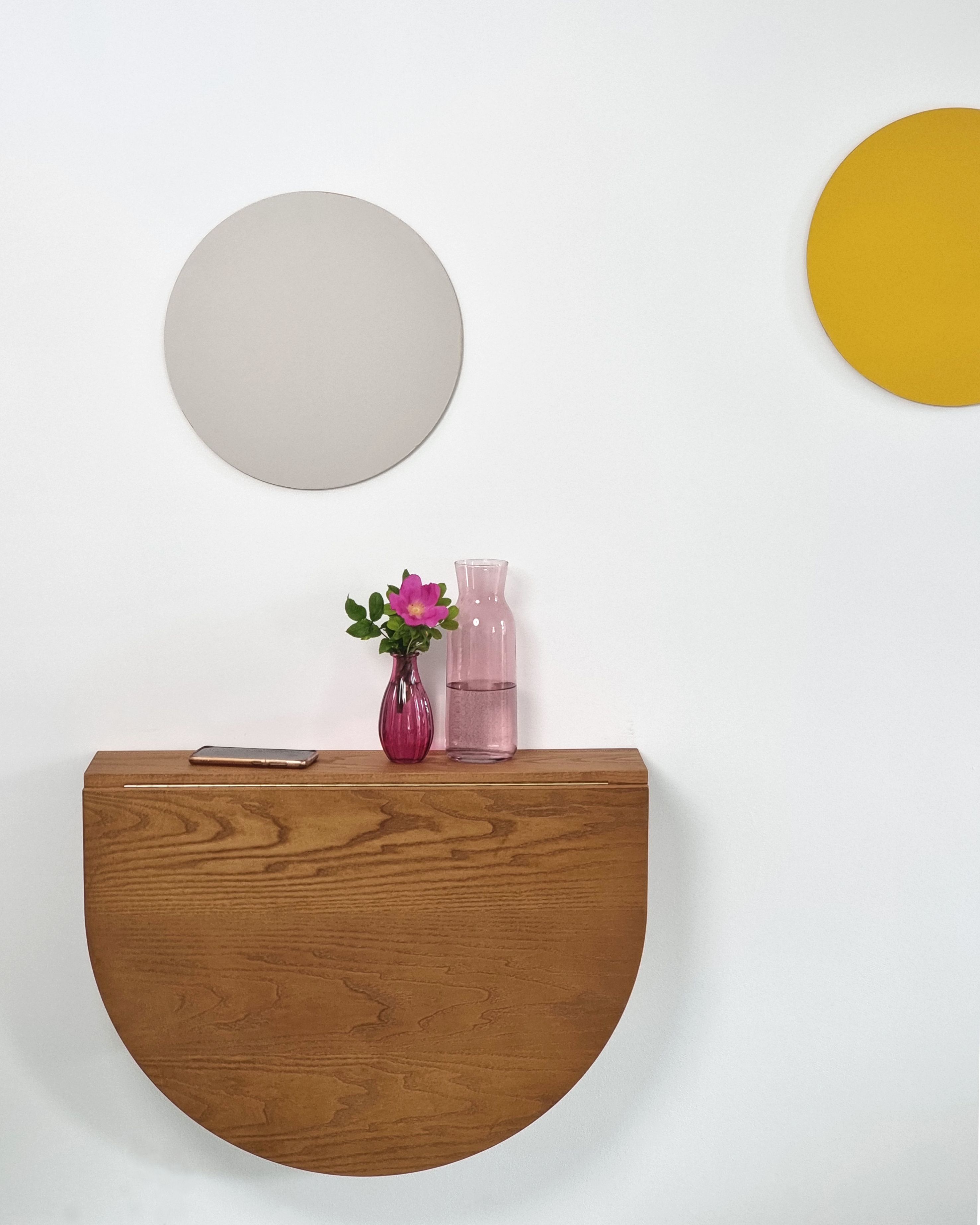 The Klapp half oval folding table is a great example of this kind of versatile design. This small folding table can serve multiple purposes—whether you need a folding dining table, a folding writing desk, or just an extra counter space. Because it’s a wall mounted folding table, it can be installed in the kitchen, living room, or even the bedroom. You can also mount it at the height that works best for you, making it even more user-friendly.
