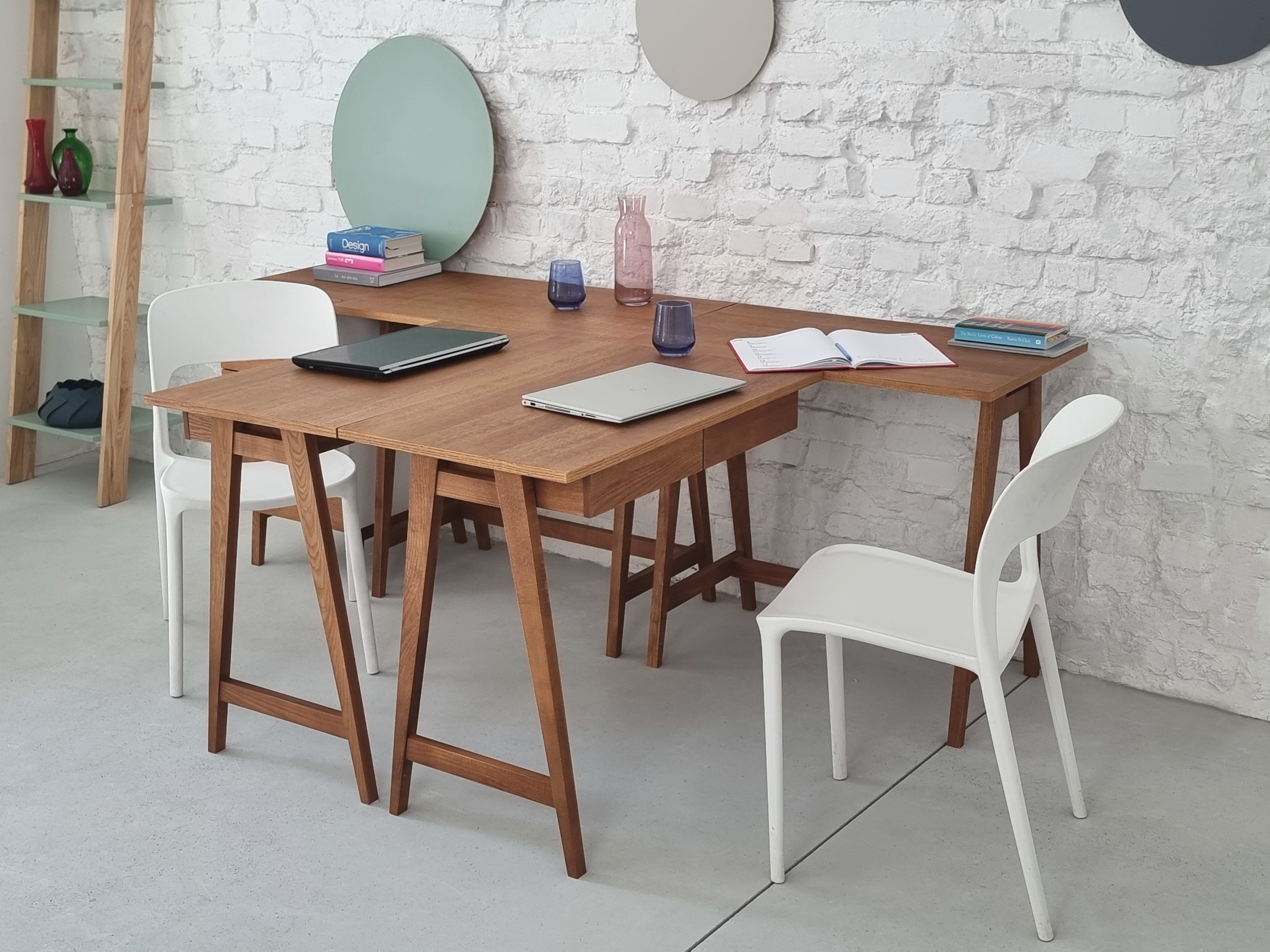 If you are in search of a larger writing desk, we recommend the Luka L-shaped study table. This study table is an excellent choice for creating an organized workspace at home. The spacious L-shaped tabletop allows you to work with your laptop and documents simultaneously. The Luka corner desk is available in two orientations (left and right) and two sizes (115 cm and 135 cm long), allowing you to choose the option that best suits your needs. The Luka l shape study table measuring 115 cm in length comes with one drawer, making it ideal for organizing office supplies. In contrast, the Luka writing desk at 135 cm is equipped with two drawers, which help keep the tabletop tidy. Both models feature footrests, which, as previously mentioned, positively impact our health by improving posture and reducing knee strain.