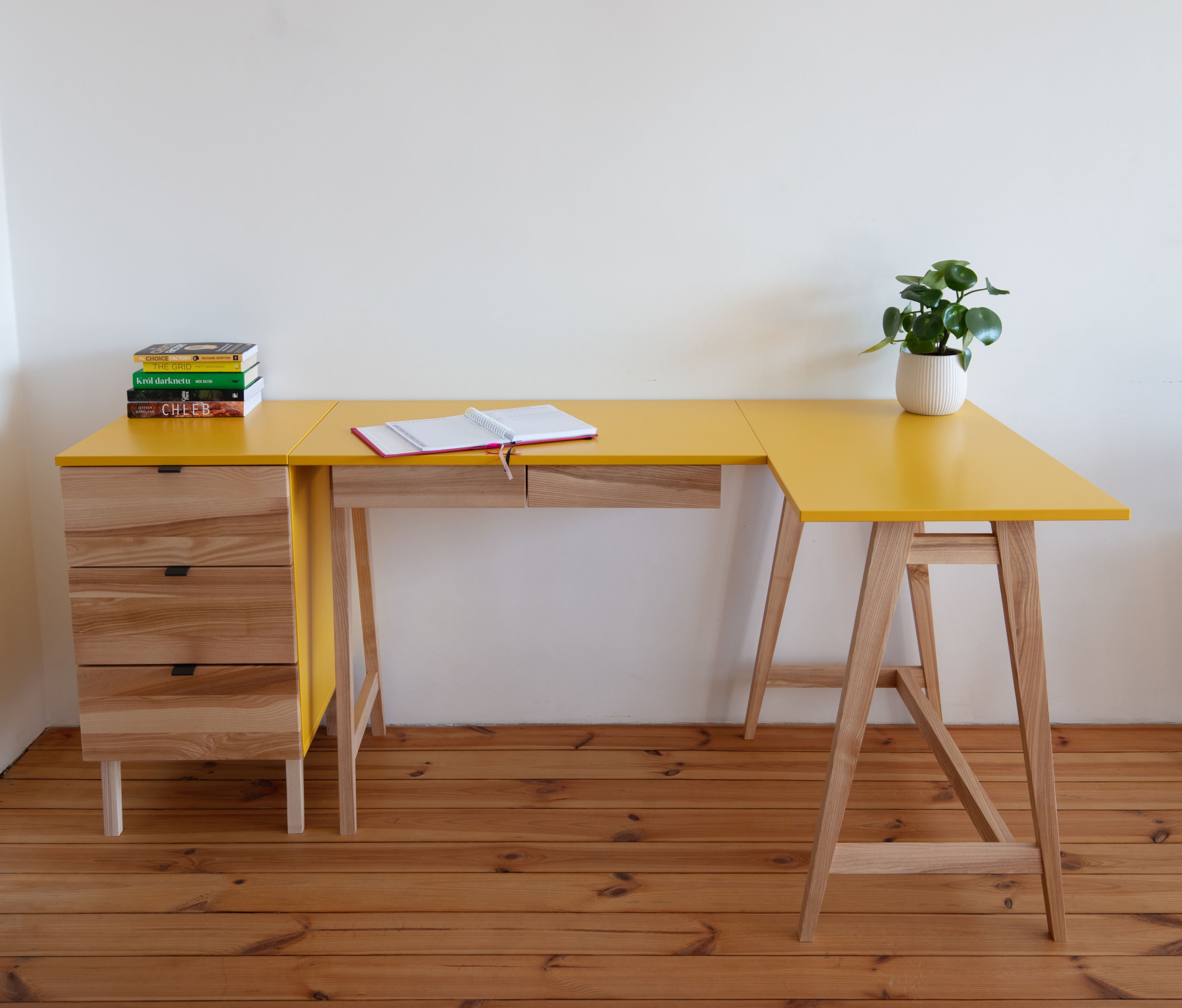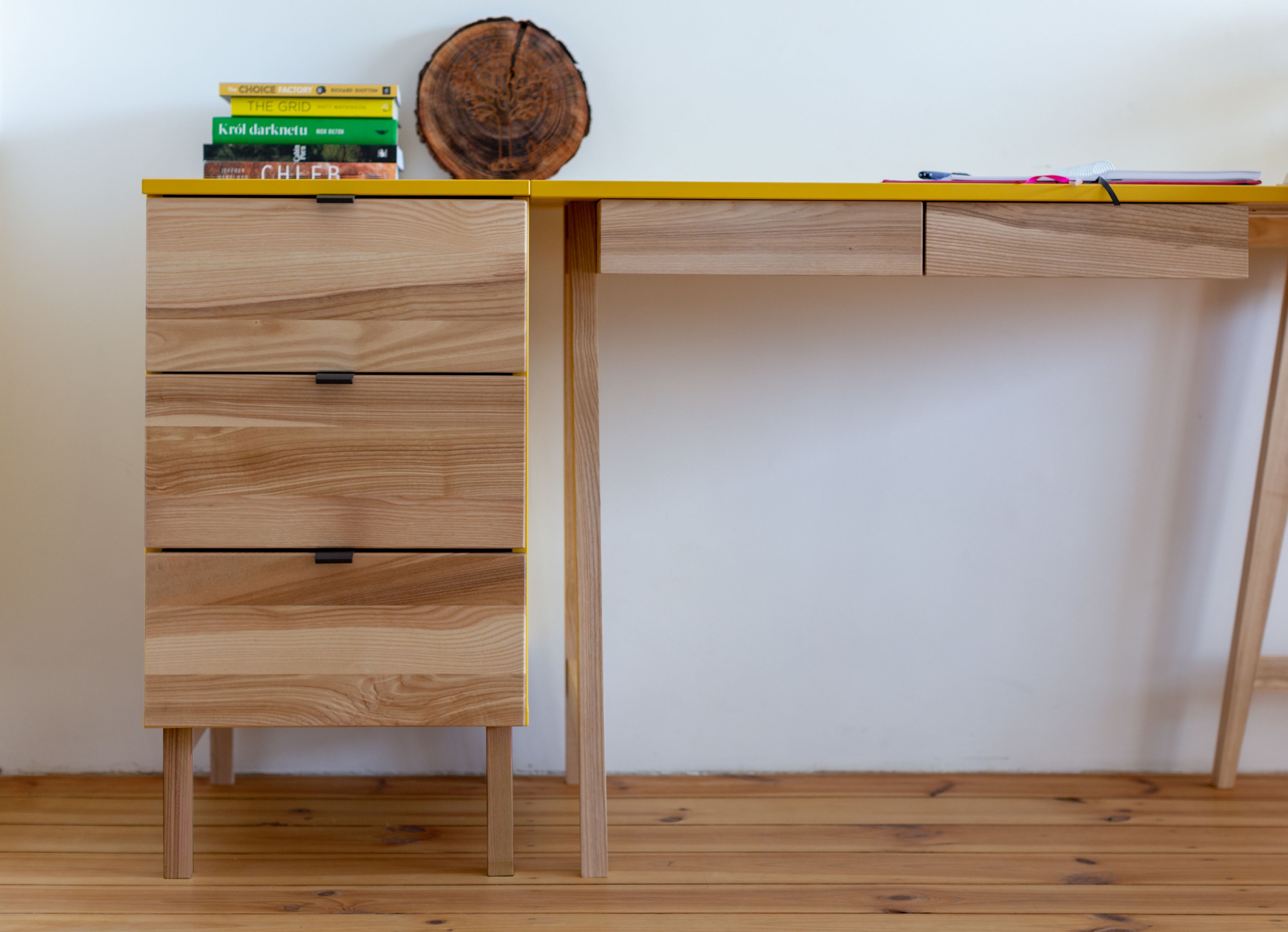 Les bureaux et meubles de rangement Luka sont disponibles en bois massif combiné avec du MDF laminé et laqué, ainsi qu'en bois massif avec placage en frêne naturel. Selon vos préférences, vous pouvez choisir un meuble coloré ou une version en bois qui ajoutera une touche chaleureuse à votre intérieur.