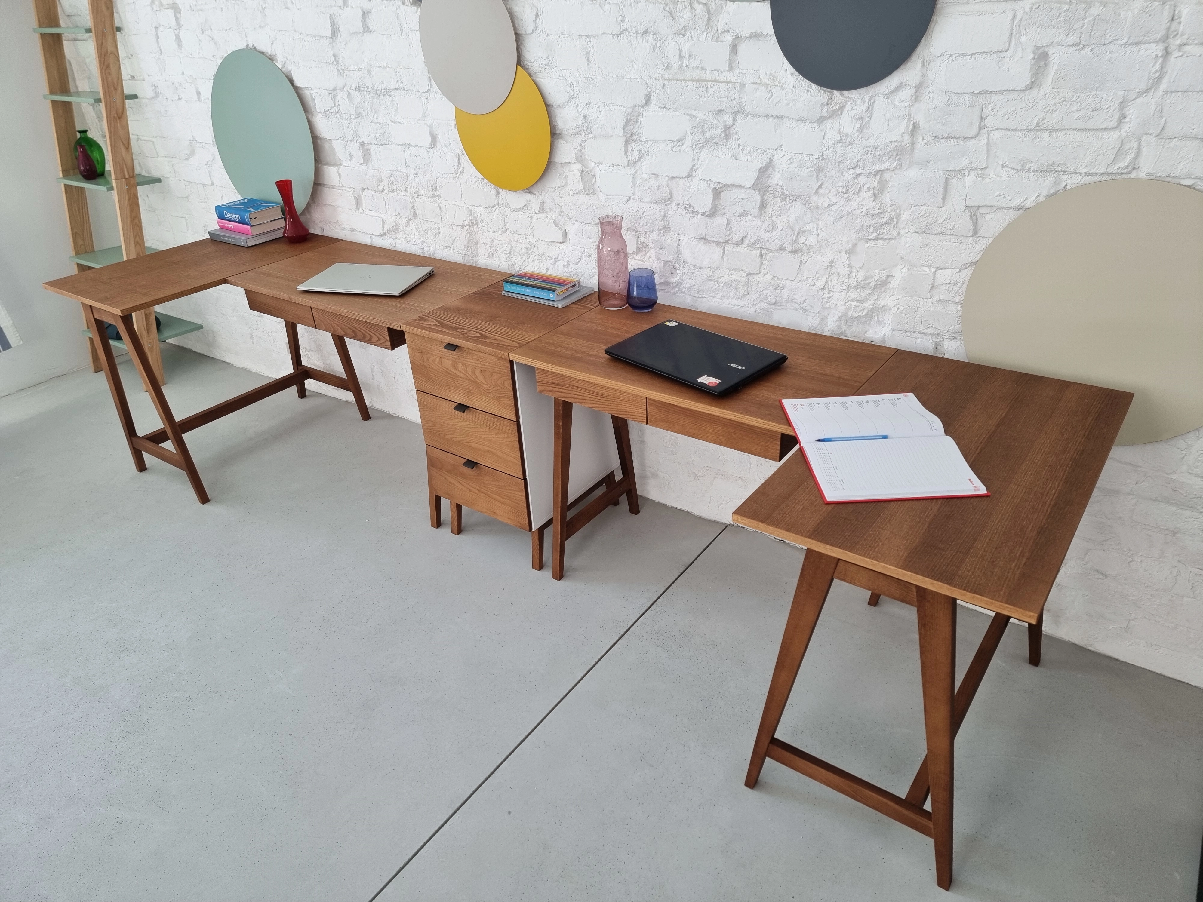 La combinaison de ces pièces de mobilier crée une grande surface de travail qui peut accueillir un ordinateur portable, une imprimante et des documents, tout en laissant encore beaucoup d'espace pour travailler. Les tiroirs des bureaux d'angle et du meuble de classement sont parfaits pour organiser les fournitures de bureau. Il existe de nombreuses possibilités de combinaisons que vous pouvez créer. La première idée est de placer le meuble de rangement entre les extrémités les plus longues des bureaux en L. La deuxième idée est de placer le meuble de classement à trois tiroirs entre les extrémités les plus courtes des bureaux en L, réduisant ainsi l'espace entre les bureaux. Une autre idée est de placer les bureaux dos à dos. Dans cette combinaison, le meuble de classement peut être placé à l'extrémité la plus courte ou la plus longue du bureau en L. De plus, vous pouvez développer la combinaison avec un autre meuble de classement contemporain. Il est également possible de combiner les deux bureaux en L sans l'unité de rangement à 3 tiroirs, mais nous recommandons l'option avec l'unité de rangement car vous disposez de plus d'espace sur la surface de travail et dans les tiroirs pour le rangement. Le ciel est la limite.