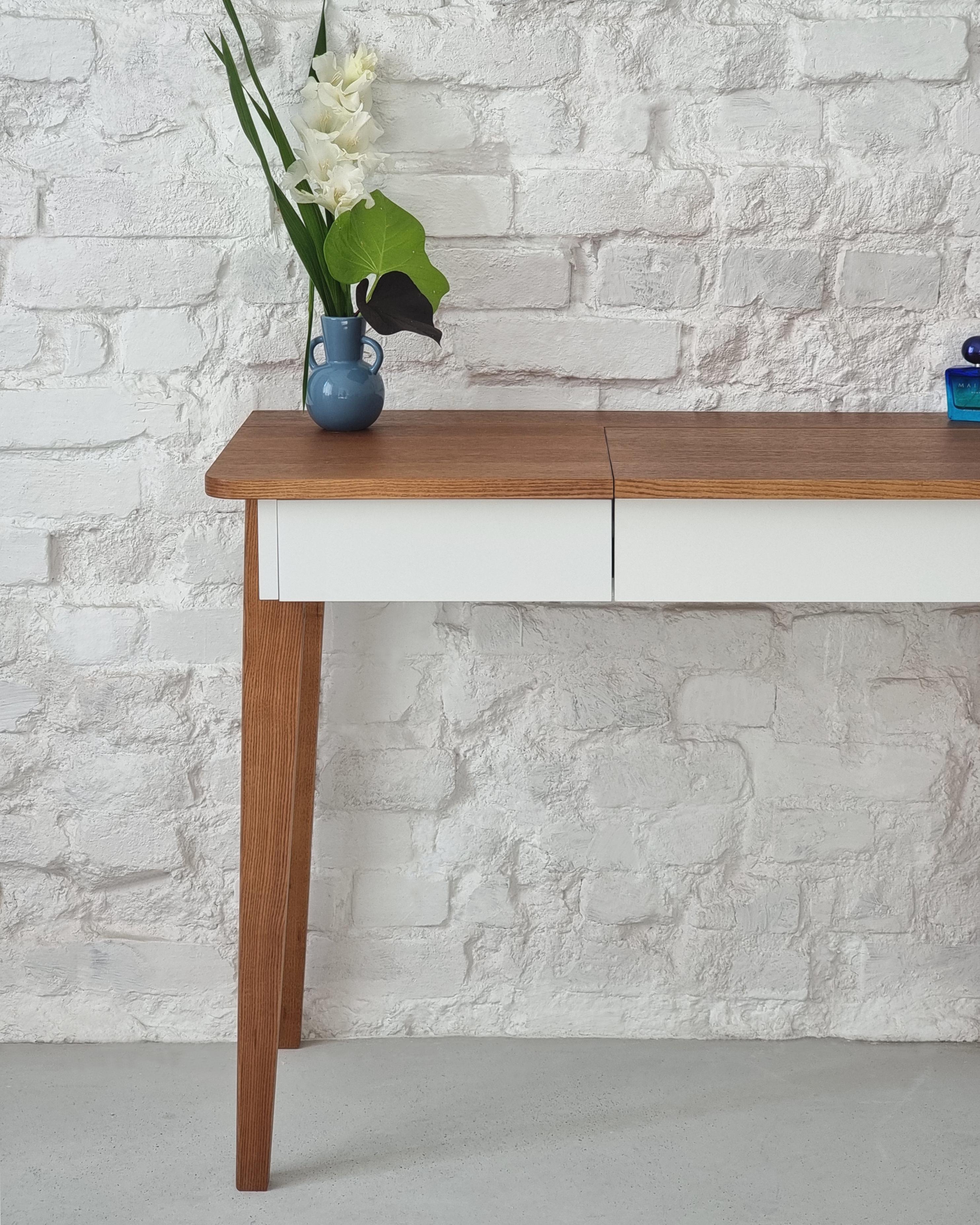 La coiffeuse avec miroir rabattable est disponible en deux versions - avec un plateau en bois et des pieds en bois ou avec un plateau en MDF et des pieds en bois. La première option réchauffera certainement l'atmosphère, car les éléments en bois de l'intérieur rendent l'espace propice à la détente et réduisent le stress. La seconde option permet de choisir parmi une large gamme de couleurs. Une coiffeuse rose sera un excellent choix comme cadeau pour une fille, en faisant son espace préféré dans la chambre. Pour un cadeau destiné aux femmes, nous recommandons une coiffeuse beige, car la couleur beige apporte un sentiment de confort et de sérénité.